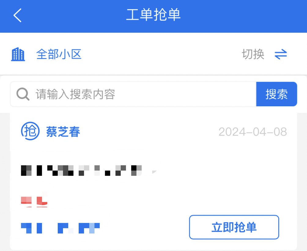 客服人员进行报事登记,并进行派工,接单人员接到派工单后处理问题,完成后回执派工单。非紧急的工单,可由物业员工通过抢单,完成派工。对紧急工单,或无人抢单的工单,由物业主管强制派工。