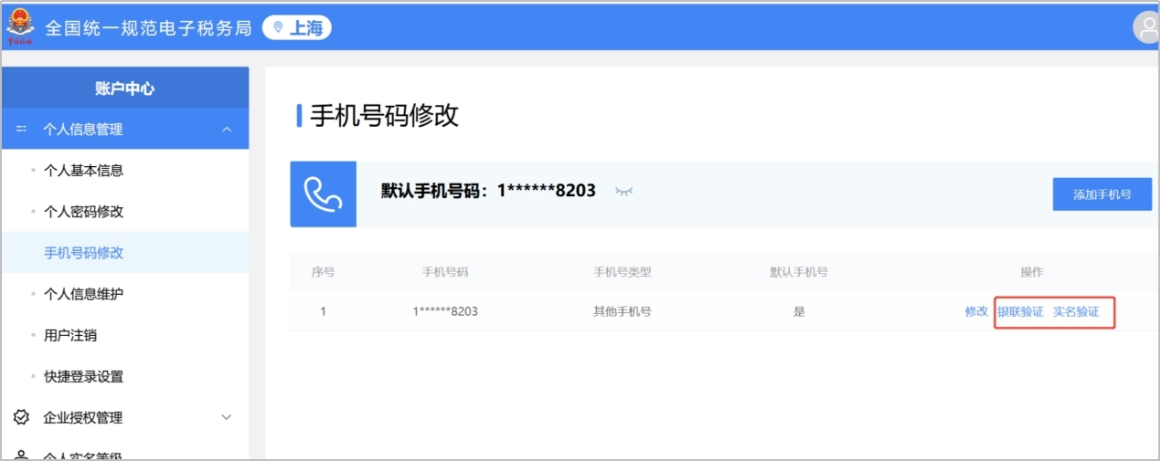解决方案:开票人员在电子税务局通过自然人登录,进入「账户中心」-「个人信息管理」-「手机号码修改」模块中对使用的手机号操作银联认证或实名认证;